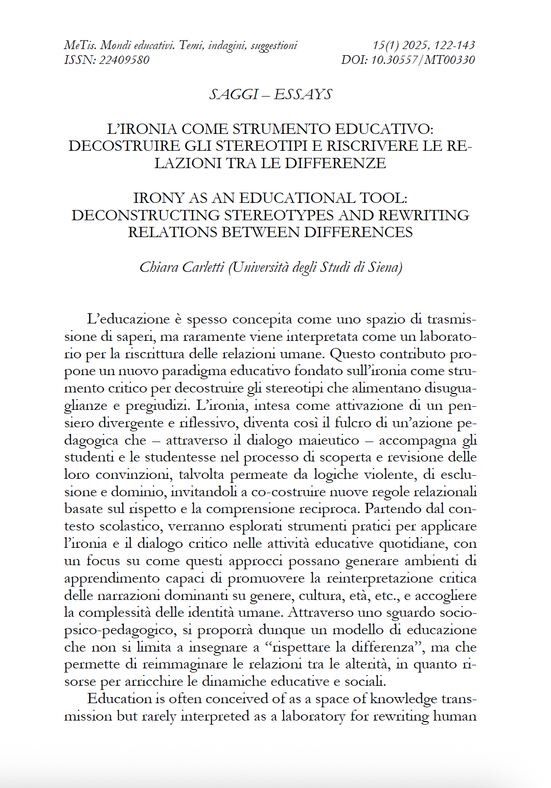 Carletti, C. (2025). L’ironia come strumento educativo: decostruire gli stereotipi e riscrivere le relazioni tra le differenze. METIS, 15(1), 122-143 DOI: 10.30557/MT00330. Vedi qui.