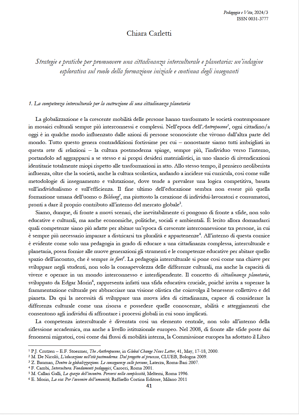 Carletti, C. (2025). Strategie e pratiche per promuovere una cittadinanza interculturale e planetaria: un’indagine esplorativa sul ruolo della formazione iniziale e continua degli insegnanti. Rivista Pedagogia e Vita, Anno 82, 2024/3, sezione online, ISSN 0031-3777.