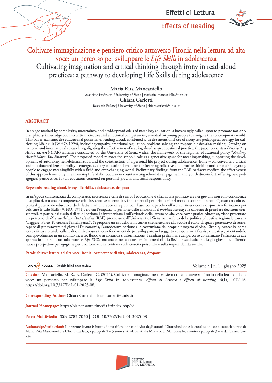 Carletti, C. & Mancaniello, M. R. (2025). Coltivare immaginazione e pensiero critico attraverso l’ironia nella lettura ad alta voce: un percorso per sviluppare le Life Skills in adolescenza. Effetti Di Lettura / Effects of Reading, 4(1), 107–116. https://doi.org/10.7347/EdL-01-2025-08